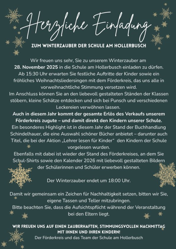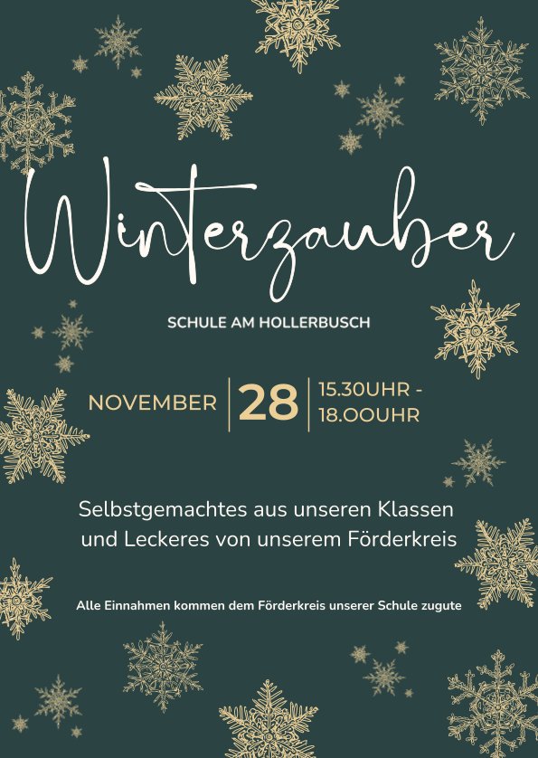 Nachmittags stand dann der „Weihnachtszauber“ an. Die Schülerinnen und Schüler führten den zahlreichen Gästen des ein Weihnachtsmusical vor. Anschließend zeigte die Rope-Skippers-Gruppe „Jumping Gums“ eine beeindruckende Show. Nach diesem abwechslungsreichen Programm konnten die Gäste beim Weihnachtsbasar Selbstgemachtes aus den Klassen kaufen. Den fleißigen Einkäufern wurde eine vielfältige Auswahl von farbenfrohen Weihnachskarten über köstliche Waffeln bis hin zu allerlei Weihnachtsdekoration und einer Hollerbusch-Zeitung geboten.In der Aula versorgte währenddessen der Förderverein der Schule gemeinsam mit fleißigen Elternhelfern die Gäste mit leckerem Punsch und einem abwechslungsreichen Buffet.Desweiteren präsentierte der Förderverein die neuen Schulshirts sowie den neuen Schulkalender 2024. Beides kann aktuell über die Klassenlehrerinnen erworben werden.Zum Abschluss des Tages gab es eine Tombola für alle Mitglieder des Fördervereins mit tollen Gewinnen. Der gesamte Erlös der Weihnachtsfeier kommt dem Förderverein und damit direkt den Kindern der Schule zugute.