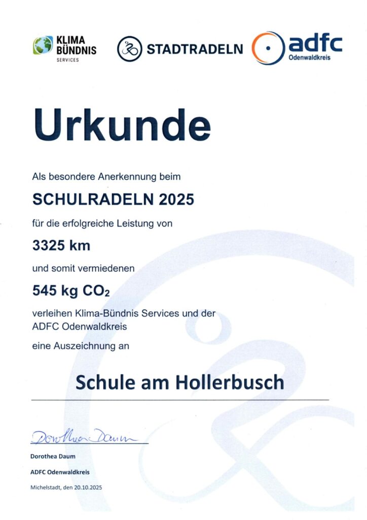 Mit einer beachtlichen Bilanz endete das Schul- und Stadtradeln 2025 im Odenwaldkreis: Innerhalb von drei Wochen wurden insgesamt 150.235 Kilometer auf dem Fahrrad zurückgelegt. Besonders aktiv waren die Schulen: 13 Bildungseinrichtungen radelten zusammen 97.715 Kilometer. Bei der Abschlussveranstaltung in Höchst, zu der der ADFC Odenwaldkreis und das Schulradelteam Michelstadt/Erbach eingeladen hatten, nahmen Frau Gaubatz und Frau Schnell unsere Urkunde entgegen.